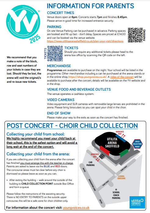 - If you are travelling by car to watch the performance, please remember to book car parking. https://www.utilitaarenasheffield.co.uk/latest-news/young-voices