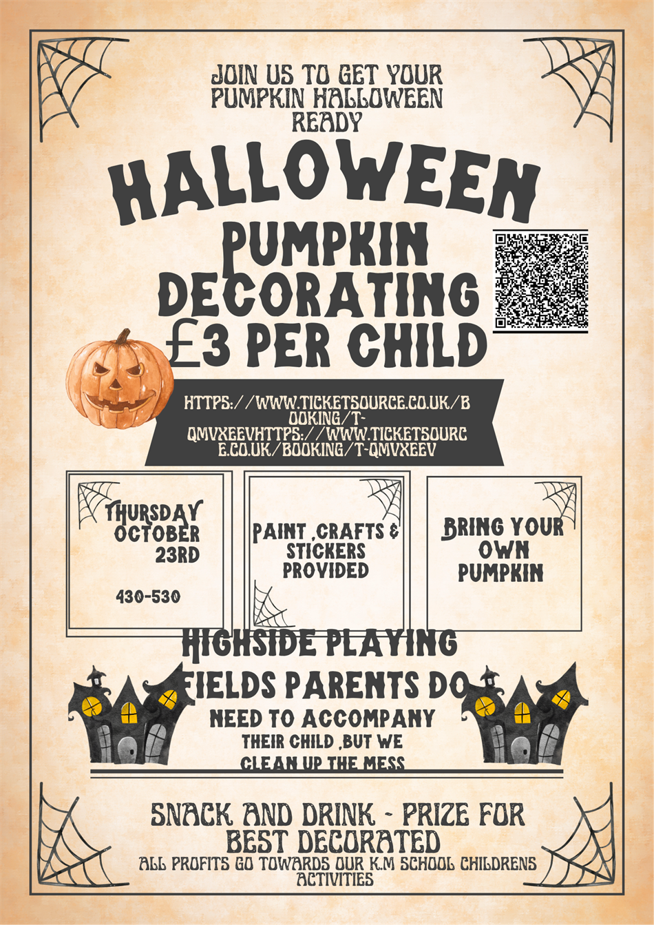 The Friends of Kirkby Malzeard have arranged a pumpkin Decorating hour at Highside playing fields. If you would like your child/children to join their friends to decorate their pumpkin then please follow the link or scan the QR code on the poster.