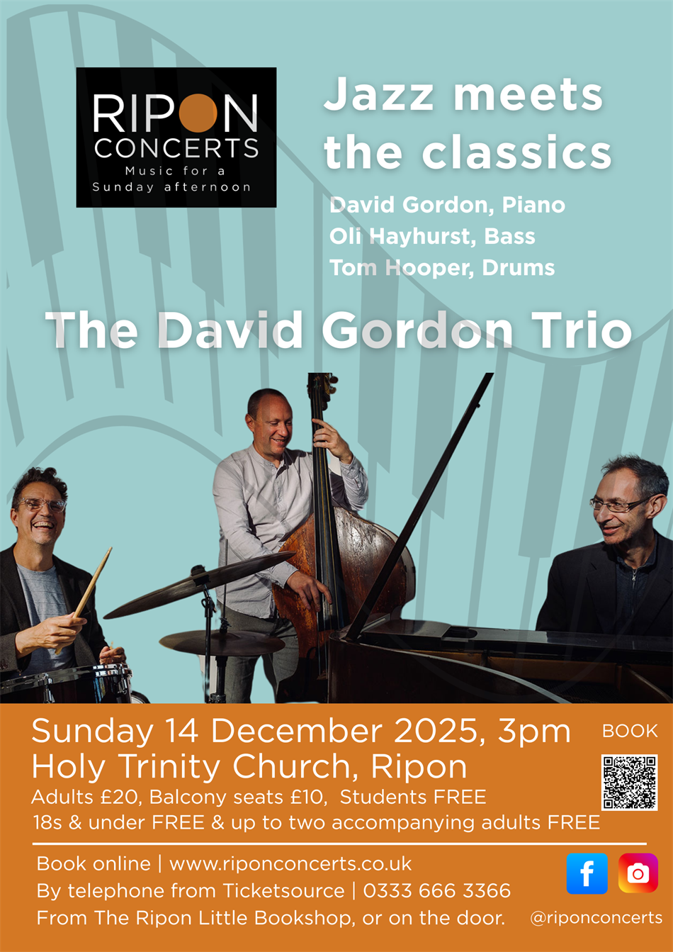 Ripon Concerts is delighted to share an exciting opportunity for your students and families. On Sunday 14 December at 3pm, the internationally acclaimed jazz pianist David Gordon, together with his trio, will be performing at Holy Trinity Church, Ripon.