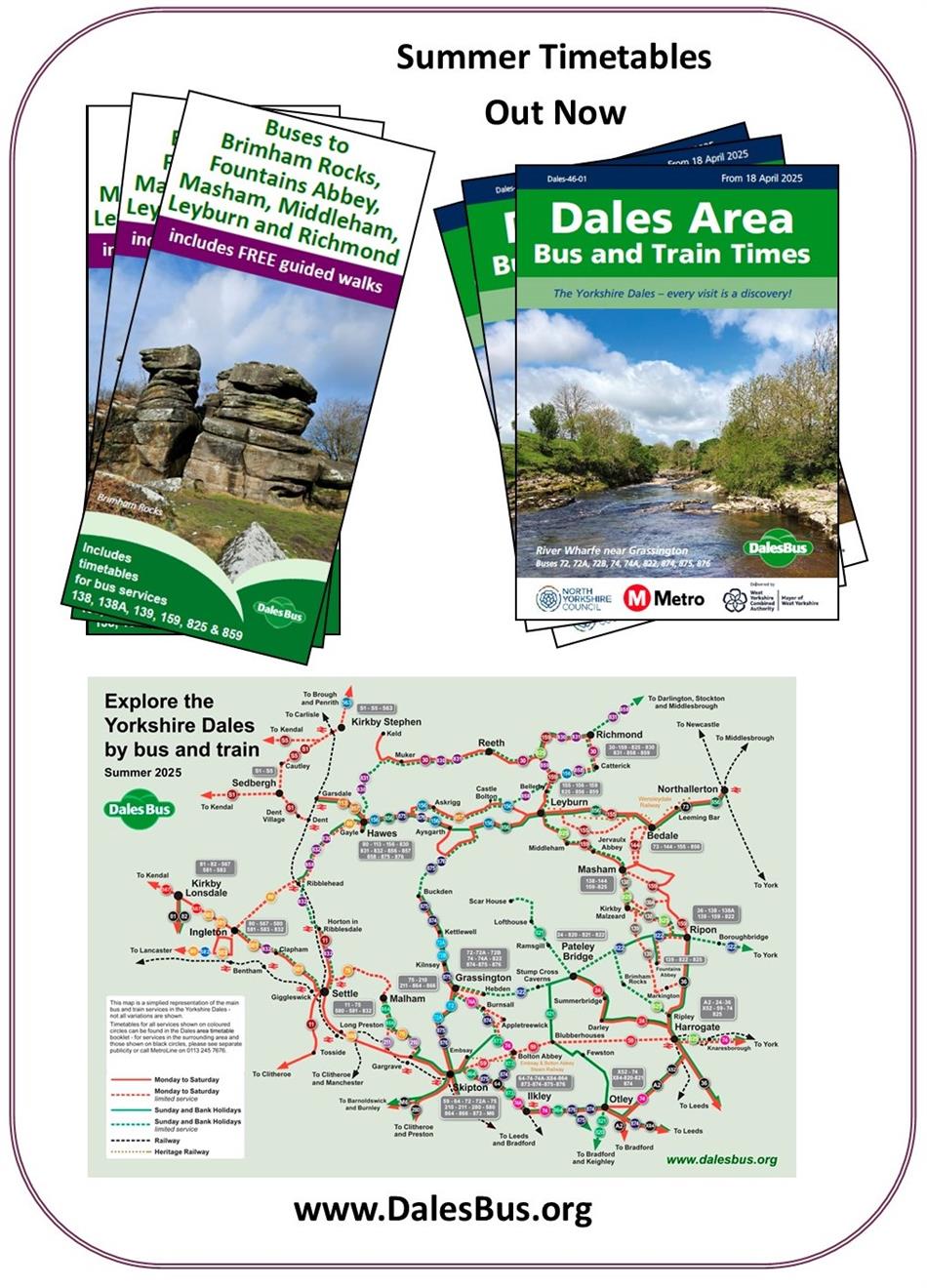 New timetables have been inserted at stops in Kirkby Malzeard, this includes the 138 & 159 Mon – Sat services, as well as the Sunday 825 DalesBus service. Leaflets and timetable booklets have been left in as many shops, pubs, community buildings s possible.
