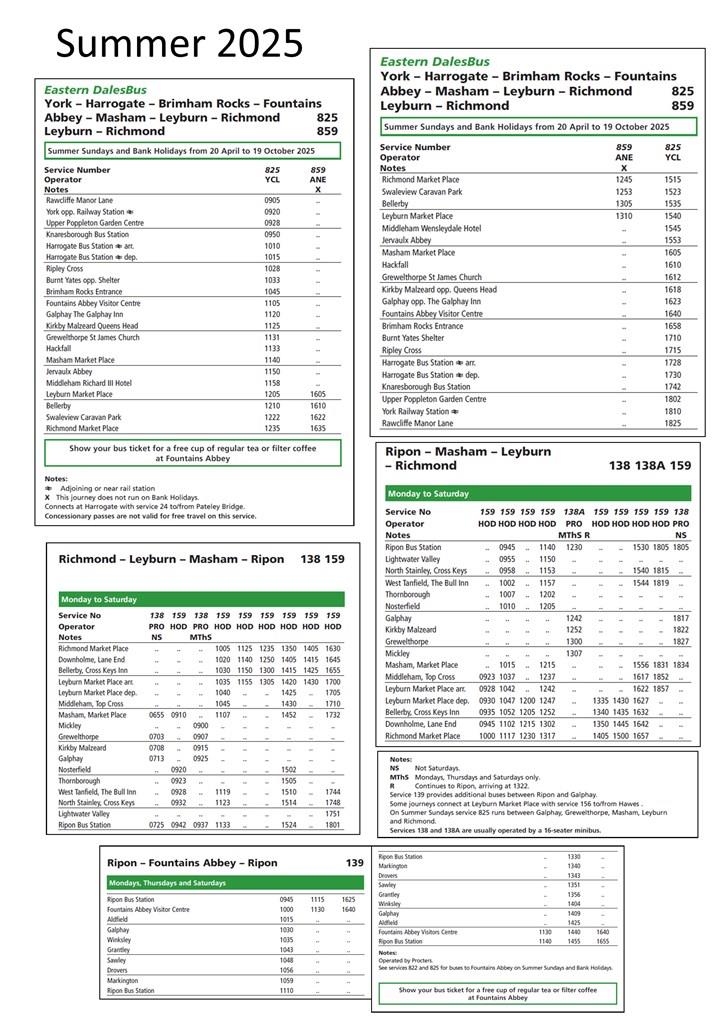 The 825 started on Easter Sunday and runs until 19 Oct 2025. It runs to Masham, Leyburn and Richmond, timetable below.